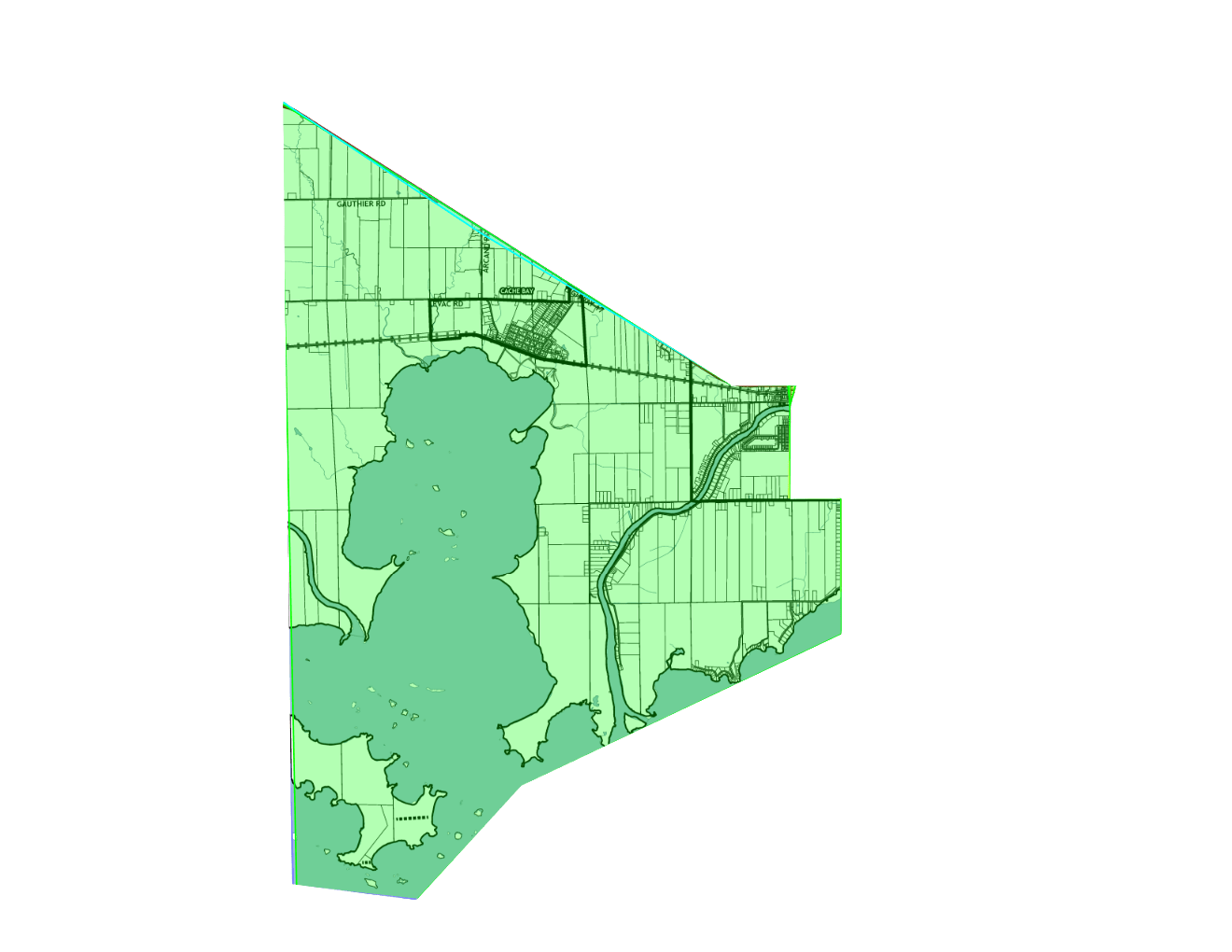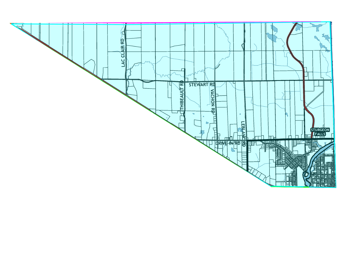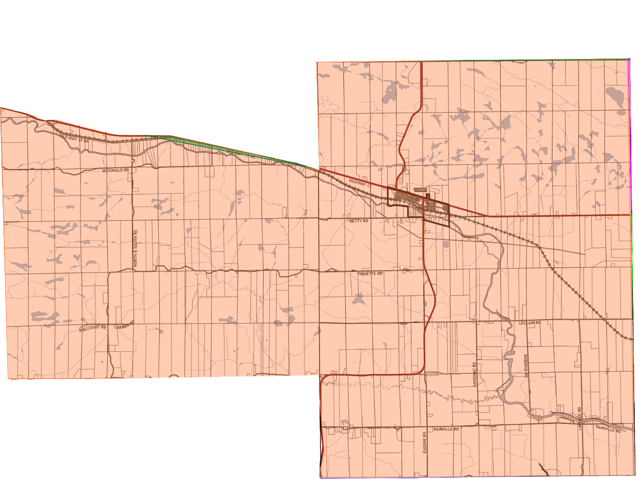Commencing at the intersection of Gauthier Road and Highway 17 thence southeasterly along the centre line of Highway 17 to Nipissing Street thence northerly along the centre line of Nipissing Street to where it meets the Sturgeon River thence northerly along the line between lots 3 and 4 of the Township of Springer to Promenade Levert thence westerly along the centre line of Levert Drive and Stewart Road to Highway 17, being the point of commencement.