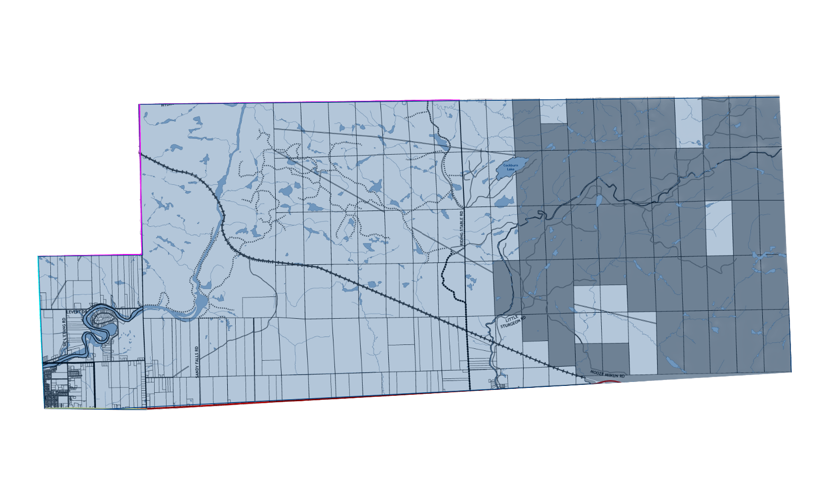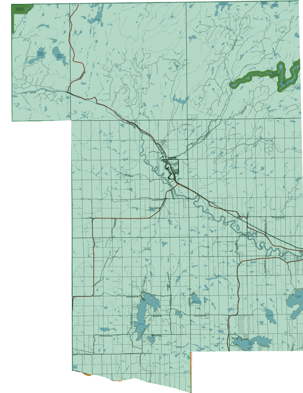 All of the townships of Kirkpatrick, Hugel, Badgerow, Crerar, Gibbons, Dana, McWilliams and the east half of Janes.